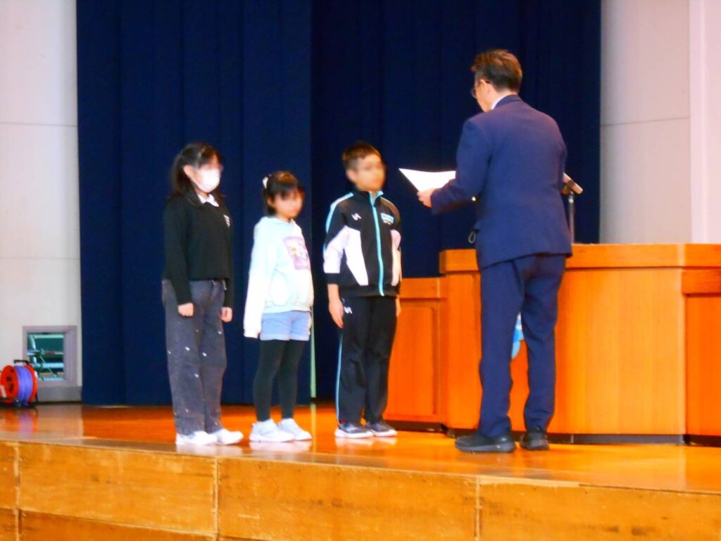 昨年10月に実施された全国珠算教育連盟の全国大会で、【小学4年生以下の部】で全国100位に入賞しました。小学校で表彰してくださいました。